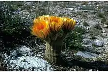 The flowering season for E. dasyacanthus is between the months of March and May. The large flower of the plant grow at the sides of the stem above the areoles close to the stem apex. The flowers are typically 8–12 cm long and 7–11 cm wide. The flowers smell sweet and are pollinated by bees. In the Trans-Pecos region of Texas the flowers are usually bright yellow with a green throat. Other color the flowers may be include dark to pale yellow, canary yellow, golden yellow or deep red to rose pink. Since this taxon of cacti are mostly yellow flowered, flowers that are beta cyanic and orange are less common. The tepals are relatively thick and durable compared to E. reichenbachii, but thin and soft compared to E. coccineus. The stamens of the flowers have filaments resulting in the floral throat being filled with a funnel of yellow anthers.[1]