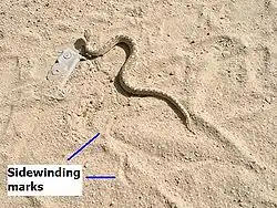 They move about mainly by sidewinding: a method at which they are considerably proficient and alarmingly quick. They are also capable of other forms of locomotion, but sidewinding seems to be best suited to moving about in their usual sandy habitats. It may also keep them from overheating too quickly, as there are only two points of contact with the hot surface in this form of locomotion.[2]
