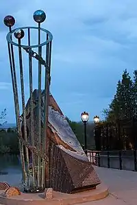 Jill Sebastian's Eclipse is located at Lake Bluff Terrace, Milwaukee, Wisconsin 2000.[1] with stairs leading to it off the lakefront. It is a collaborative piece made out of vitreous glass and stone mosaic over concrete, bronze. The dimensions are 10’ x 10’ x 10'.[1] Made in 2003, this sculpture is still in very good condition.
