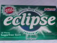 Eclipse is a brand that promises to give users "powerful fresh breath". It comes in blister packs of 12, the Big-E-Pak – 60 count plastic container of candy-coated pellets, and the recently added split packs that include 18 pellets. Eclipse gum is available in the U.S, Australia and Latvia, but are also sold in Canada under the name Excel.