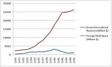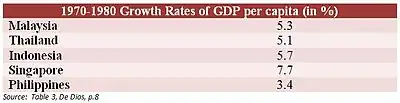 After experiencing years of positive growth, the Philippine economy between 1973 and 1986 suffered a downturn due to a mixture of economic mismanagement and political instability amidst a global economic recession. After the 1972 Martial Law declaration, Marcos continued his strategy of relying on international loans to fund the projects that would support the booming economy, prompting later economists to label this a period of "debt driven" growth.[59] Massive lending from commercial banks, accounting for about 62% percent of external debt, allowed the GDP of the Philippines to rise during martial law.[60] Much of the money was spent on pump-priming to improve infrastructure and promote tourism. However, despite the aggressive borrowing and spending policies, the Philippines lagged behind its Southeast Asia counterparts in GDP growth rate per capita. The country, in 1970–1980, only registered an average 5.73 percent growth, while its counterparts like Thailand, Malaysia, Singapore, and Indonesia garnered a mean growth of 7.97 percent.[54] This lag, which became very apparent at the end of the Marcos Regime, can be attributed to the failures of economic management that was brought upon by State-run monopolies, mismanaged exchange rates, imprudent monetary policy and debt management, all underpinned by rampant corruption and cronyism.[54]
