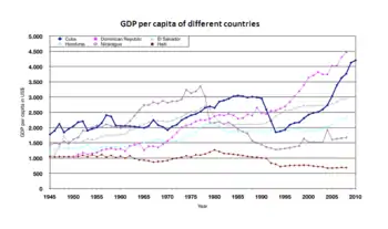 Between 1970 and 1985, Cuba experienced high-sustained rates of growth; according to Claes Brundenius, "Cuba had done remarkably well in terms of satisfying basic needs (especially education and health)" and "was actually following the World Bank recipe from the 1970s: redistribution with growth".[24] During the Cold War, the Cuban economy was heavily dependent on subsidies from the Soviet Union, valued at $65 billion in total from 1960 to 1990 (over three times as the entirety of U.S. economic aid to Latin America through the Alliance for Progress), an average of $2.17 billion a year.[25] This accounted for between 10% and 40% of Cuban GDP, depending on the year.[26] While the massive Soviet subsidies enabled Cuba's enormous state budget, they did not lead to a more advanced or sustainable Cuban economy. Described by economists as "a relatively highly developed Latin American export economy" in 1959 and the early 1960s, Cuba's fundamental economic structure changed very little between then and 1990. Tobacco products such as cigars and cigarettes were the only manufactured products among Cuba's leading exports, and a pre-industrial process produced even these. The Cuban economy remained inefficient and over-specialized in a few highly subsidized commodities provided by the Eastern Bloc countries.[27] Following the fall of the Soviet Union, Cuba's GDP declined by 33% between 1990 and 1993, partially due to the loss of Soviet subsidies[28] and a crash in sugar prices in the early 1990s. This period of economic stagnation and decline is known as the Special Period. Cuba's economy rebounded in the early 2000s due to a combination of marginal liberalization of the economy and heavy subsidies from the government of Venezuela, which provided Cuba with low-cost oil and other subsidies worth up to 12% of Cuban GDP annually.[25]