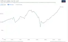 Rwanda's economy suffered heavily during the 1994 Genocide, with widespread loss of life, failure to maintain the infrastructure, looting, and neglect of important cash crops. This caused a large drop in GDP and destroyed the country's ability to attract private and external investment.[23] The economy has since strengthened, with per-capita GDP (PPP) estimated at $2,225 in 2018,[24] compared with $416 in 1994.[24]