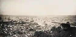 The absolute value of the exports of the Empire in 1850 was the highest in Latin America (triple that of Argentina, which was in fourth place); Brazil would keep this position in this respect and in general economic terms until the end of the monarchy.[23] Brazil's international trade, that is, the sum of both its imports and exports, amounted to a total value of Rs 79.000:000$000 between 1834 and 1839 and increased every year until it reached Rs 472.000:000$000 in 1886 (an annual growth of 3.88% since 1839). In 1859 the balance of payments between imports and exports reaches equilibrium; exports gradually increase relative to imports, and the Empire's balance of trade becomes consistently positive from 1865 on. After 1874, the balance of payments becomes clearly favorable. Most Brazilian exports were agricultural goods.[24] For comparison, between 1850 and 1900 agricultural goods constituted between 73% and 83% of the United States' total exports.[25] Economic growth was perceived in the Brazilian Gross Domestic Product (GDP), which from circa 50.000:000$000 in 1840, reached a figure of 500.000:000$000 in 1889 (an incredible annual growth rate of 4.81% since 1840).[2] Brazilian economic growth, especially after 1850, compared "very well" with that of the United States and the European countries, according to the historian Boris Fausto.[26] Brazil in the last year of the monarchy was a “prosperous and [internationally] respected” country, according to historian Oliveira Lima.[27] The historian Heitor Lyra wrote that: