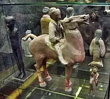 Han government workshops produced common, luxury, and even artistic funerary items, such as the ceramic figurines and tomb tiles which adorned the walls of underground tombs.[81] Imperial workshops were operated by the Minister Steward, whose ministry controlled the treasury and the emperor's private finances.[82]