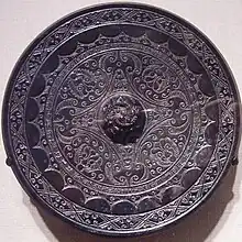Han lacquerwares were privately made as well as being manufactured in government workshops.[85] Hundreds of laborers could be employed to work on a single luxury item, such as a lacquered cup or screen.[86] Some lacquerwares were inscribed simply with the clan name of the family who owned them. Others were inscribed with the titles of the owner, the specific type of the vessels, their capacities, the precise day, month, and year of manufacture (according to Chinese era names and their lunisolar calendar), the names of the floor managers who oversaw the items' production and the names of the workers who made them.[87] Even some iron implements made during the age of the monopoly bore inscriptions of the date they were made and the name of the workshop.[88] Bronze calipers from the Xin dynasty, used for minute measurements, had an inscription stating that it was "made on a gui-you day at new moon of the first month of the first year of the Shijian guo period." The calipers date from 9 AD.[89] Han lacquerwares bearing the imperial mark of the emperor have been found far beyond the Han capital regions by modern archaeologists, in places such as Qingzhen (in Guizhou), Pyongyang (in North Korea), and Noin Ula (in Mongolia).[90]