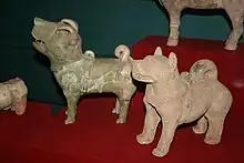 The main agricultural staple foods during the Han dynasty were foxtail millet, proso millet, rice (including glutinous rice), wheat, beans, and barley.[99] Other food items included sorghum, taro, mallow, mustard plant, jujube, pear, plum (including Prunus salicina and Prunus mume), peach, apricot, and myrica.[100] Chicken, duck, goose, beef, pork, rabbit, sika deer, turtle dove, owl, Chinese bamboo partridge, magpie, common pheasant, crane, and various types of fish were commonly consumed meats.[101]