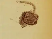The colony can grow by budding, a form of asexual reproduction, new zooids growing from the stolon.[5] In spring and early summer, sexual reproduction takes place. Ecteinascidia turbinata is a simultaneous hermaphrodite with eggs and sperm being produced by each individual. After fertilisation, the eggs are brooded in the body cavity for about a week. They then develop into bright yellow, tadpole-like larvae with a distinct notochord which pass out into the water column. They can swim and have a yolk on which they feed for several days. When this is exhausted they need to find a suitable place to settle and metamorphosize into a juvenile sea squirt, ready to start a new colony.[3]