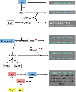 Like the other two germ layers – i.e., the mesoderm and endoderm – the ectoderm forms shortly after fertilization, after which rapid cell division begins. The position of the ectoderm relative to the other germ layers of the embryo is governed by "selective affinity", meaning that the inner surface of the ectoderm has a strong (positive) affinity for the mesoderm, and a weak (negative) affinity for the endoderm layer.[6] This selective affinity changes during different stages of development. The strength of the attraction between two surfaces of two germ layers is determined by the amount and type of cadherin molecules present on the cells' surface. For example, the expression of N-cadherin is crucial to maintaining separation of precursor neural cells from precursor epithelial cells.[2] Likewise, while the surface ectoderm becomes the epidermis,[6] the neuroectoderm is induced along the neural pathway by the notochord, which is typically positioned above it.[2][4]