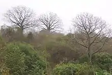 Most plants shed their leaves during the dry season to reduce water loss, and stop photosynthesis. The Ceiba trichastandra has a green bark that lets it continue photosynthesis without leaves.[8] This tree, which emerges from the canopy, has wood that rots easily and therefore has often been spared by loggers.[9] Several species of kapok trees (Ceiba genus) grow thorns on their trunks when young for protection against animals seeking water, but discard the thorns as they mature.[3] Other adaptations include a waxy layer on leaves to reduce evaporation, closing leaves at night to reduce the exposed area and storing water in thick roots or stems.[8]