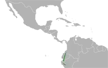 The Ecuadorian seedeater is found on the west slope of the Andes from southwestern Colombia's Nariño Department through western and central Ecuador into northern Peru, perhaps as far south as the Department of Piura. It inhabits openings in and edges of humid montane and secondary forest and is closely associated with bamboo. In elevation it ranges mostly from 1,100 to 2,300 m (3,600 to 7,500 ft) and locally as low as 800 m (2,600 ft).[10]