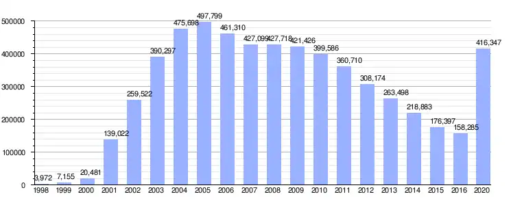| Population (1998-2020) Foreign population in Spain of Ecuadorian nationality according to the Instituto Nacional de Estadística.[4]