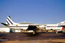 The airline's livery featured a tailfin logo of alternating blue and white diagonal stripes. The airline operated Lockheed L-188 Electra four-engined turboprop airliners on longer distance scheduled passenger services, including the key Quito-Bogota-Miami route, between March 1967 and March 1975.[3]