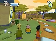 Ed, Edd n Eddy: The Mis-Edventures is a 3D platforming game in which protagonists Ed, Edd, and Eddy are playable characters. Players can use them in special tag team formations like the "(Leaning-)Tower-of-Eddy" (as Eddy), "Trampol-Edd" (as Edd), and "Batter-Ed(-Ram)" (as Ed) to complete eight levels, referred to as scams. The Eds' normal weapons and skills include Ed lifting heavy objects and smashing his head, Edd using a slingshot to hit distant targets and smacking with his ruler in close range, and Eddy using the El Mongo stink bomb to stun enemies,[1] along with using his wallet attached to a chain like a yo-yo.