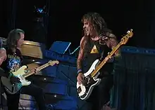 The original lineup was short-lived, with vocalist Paul Day being the first casualty as, according to Harris, he lacked "energy or charisma on stage".[70] He was replaced by Dennis Wilcock, a Kiss fan who used makeup and fake blood during live performances.[70] Wilcock's friend, guitarist Dave Murray, was invited to join, much to the dismay of the band's guitarists Dave Sullivan and Terry Rance.[71] Their frustration led Harris to temporarily disband Iron Maiden in 1976,[71] though the group reformed soon after with Murray as the sole guitarist. Harris and Murray remain the band's longest-serving members and have performed on all of their releases.