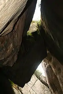 These are not technically caves, but rather a cleft, rift or rock shelter approximately 96 ft (29 m) by 22 ft (6.7 m), a 30-foot-deep (9.1 m) fissure caused by a piece of rock splitting away from the main body. On one side of the cleft is a rock weighing several tons that covers the cleft to form the 'roof' of the cave. The carvings are of human and animal figures, tools used by humans and of symbols yet to be deciphered, suggesting the presence of a prehistoric settlement.[5]