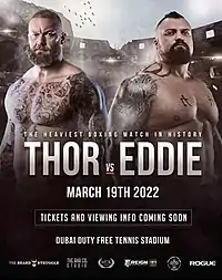 Eddie Hall vs. Hafþór Björnsson, formerly known as "The Heaviest Boxing Match in History",[4] before being overtaken by Boogie2988 vs. Wings of Redemption on the KSI vs Joe Fournier Misfits Card, was a boxing match between strongmen Eddie Hall and Hafþór Björnsson that took place on 19th March 2022. Both have won the strongman competition "World's Strongest Man" owned by IMG Worldwide. Prior to Hall's injury, the match was set to take place on September 18, 2021 at VyStar Veterans Memorial Arena in Jacksonville, Florida.[5] The replacement match in September 2021 was between Björnsson and Devon Larratt in Dubai while the match against Hall was rescheduled to March 19, 2022.[6]
