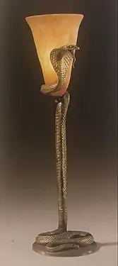 As a result of Brandt's Escalier Mollien commission, Brandt's influence among the publicity and the decorative-arts community increased. In turn, he began to expand his presence and started to collaborate with architects, the Daum Freres glassworks, and the suppliers of marble and alabaster. Brandt did a number of works with Daum, specifically when designing lamps and chandeliers. Two lamps in particular Brandt designed with Daum are the La Tentation and the Cobra lamps. Both lamps depict snakes rising from their bases and cradling an alabaster Daum glass shade. Favier began working with Brandt in 1919 when Brandt sought him out to create a new set of buildings to house the Brandt company. From that time on, Favier headed Brandt's design staff up until he resigned in 1927. Favier worked on a number of works with Brandt including Brandt's work in the 1925 Exposition.