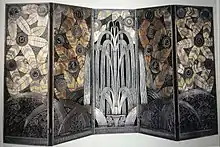 Also on display within Brandt's display room was his most renowned work, L’Oasis. The five-panel screen was inspired by Jean Dunand's ancient Japanese lacquered screens. According to Joan Kahr, “The formal symmetry of the screen and the small scrolls reflect Brandt's early, classically feminine repertoire, while various newer elements allude to the emerging style moderne. The ripples of falling water and the crimped gearlike flowers also show the influence of a machine-inspired aesthetic, with its emphasis on movement and speed” (Kahr, 143). Through the use of stylized repetitive forms, Brandt is able to meld ancient decorative motifs with the modern focus on the machine. Although to the amateur eye the screen does not seem that complex, the technical superiority of its assembly provides proof of Brandt's sophistication as an ironworker. In 1925, L’Oasis became a well-known visual entity that was referenced on other decorative arts during that time. For example, the central fountain displayed on the screen as well as the foliage have been replicated on other works such as theater sets, perfume labels, and wallpapers.
