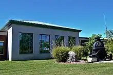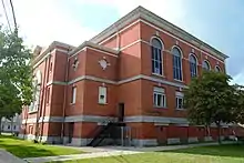 Edgerton's landscape contains a significant amount of notable architecture, most of which was built in the 1900s.[26] The Holy Rosary Church Complex, built in the Spanish eclectic style, is listed on the National Register of Historic Places and currently contains an affordable housing complex and Mary's Place Refugee Outreach.[156] After a fire consumed its century-old chapel in the 1970s, Lake Avenue Memorial Baptist Church was reconstructed as a precast concrete Modernist building to capture the "changing role of urban churches"; today, the congregation describes itself as an open and affirming, anti-racist, multiracial congregation that has a special focus on serving Edgerton's Burmese population.[157] The Maplewood Branch YMCA, built to be "the best little 'Y' branch in the world" by famed architect Claude Bragdon, is one of the last two YMCA locations located within the city of Rochester.[158][159][160] The neighborhood's largest building is Thomas Jefferson High School building, which occupies two-and-a-half acres and contains a transitional education school for immigrants and refugees.[161][84] Edgerton's tallest building, the fourteen-story Lake Tower, is Rochester's second-largest public housing complex, featuring a community room, a lending library, and a powerful tenant association.[84][162][163]