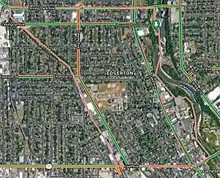 Today, the primary mode of transportation in Edgerton is privately owned passenger vehicles, which primarily traverse the four collector roads that bound the neighborhood. The street in the north, Driving Park Avenue, is named after "the most famous racetrack in the world" that once bordered the street.[151] The western street, Dewey Avenue, is named after Battle of Manila Bay victor George Dewey.[152] The southern street, Lyell Avenue, is named after the local highway commissioner who developed the street, Philip Lyell.[153][154] The eastern street, Lake Avenue, is named for its role in connecting downtown Rochester to Lake Ontario.[153] Of these four streets, Lake Avenue is the busiest road, seeing an average of roughly one car every three seconds on its north-south street. Local roads like Fulton Avenue, Locust Street, and Parkway serve to connect residential blocks to the main thoroughfares.[155]