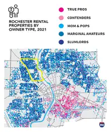 The strongest institution in modern day Edgerton is not city government, religious institutions, or community organizations. Instead, it is a network of landlords who dominate a local property base that is almost exclusively residential. A 2021 study revealed that the overwhelming majority of these landlords were either slumlords or "amateurs" who "barely maintain and do not invest in their properties." The same study found that half of all rental properties in neighborhoods like Edgerton had one or more outstanding code violations, suggesting that landlords inflict extensive property degradation on the neighborhood.[82] A 2018 study found that the majority of homes in Edgerton were purchased with cash, indicating a low rate of occupant-owned properties.[83] In a representative subsection of the neighborhood east of Edgerton Park, at least 85% of housing units were owned by individuals or companies from outside of Rochester.[84] Many rental properties in Edgerton are owned by out-of-state landlords, including property management companies located in places like Canada and Mexico.[84] Residents, who call themselves "victim[s] of redlining," struggle to obtain homeowner's insurance because they are deemed to live in an "at risk" neighborhood.[85]