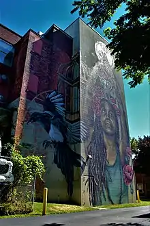 In addition to these public parks, Edgerton is also home to two newer, semi-public parks. In the early 2000s, a group of volunteers transformed the trash-filled lot next to the Dewey Avenue post office into the Garden of Peace & Life, which features a mural titled "In the Garden" that depicts landmarks in Edgerton and neighboring Maplewood.[145] The Gateway, a pocket park located at the corner of Dewey and Ravine Avenues in the northwest section of the neighborhood, is a once-vacant lot filled with trees, shrubs, perennials, boulder seats, and a lending library kiosk; established in 2013, government officials abandoned plans to take formal stewardship of the park, which now sits unmaintained.[146][147] Other notable non-park green spaces include a two-acre meadow on Kay Terrace and the Old Erie Canal Bed, a seven-acre field that runs along the western edge of the neighborhood.[84]