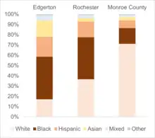 Edgerton is the poorest neighborhood in Rochester, with median household income of $17,200; 98% of households have annual incomes of less than $25,000.[99] Nearly two-thirds of all Edgertonians receive SNAP benefits.[103] Edgerton has one of the lowest educational attainment rates in Rochester, with roughly 25% resident never having graduated from high school and less than 20% having a bachelor's degree or more. Just half of Edgertonians are in the workforce; of those, roughly 25% are unemployed, with the rest working in the healthcare, manufacturing, retail, hospitality, and education sectors. Few, if any, Edgertonians work in management positions, as police officers, or as engineers.[103][104][105][106]