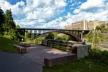 The power of these "Good Government" reformers, channeled and magnified through institutions like the ward structure and the neighborhood's religious and business organizations, not only brought a "new vitality to Rochester," but "enriched the lives of a whole generation."[22] These reformers built a new "progressive wing of the Republican party in Rochester," whose anti-machine stance influenced local, state, and national policies through politician-entrepreneurs like James Johnston, Charles S. Baker, John Van Voorhis, and Lewis Selye.[23][8] It crossed the Genesee by erecting the steel arch Driving Park Bridge, brought Rochester's first streetcars to Edgerton, and expanded those rail lines into one of the best public transit systems in the city.[14][24][25] It drew Frederick Law Olmsted in to redesign Jones Square Park while create Lower Falls Park.[26] And it created feminist organizations like Woman's Educational and Industrial Union, "one of the most significant developments" in Rochester's labor history.[14]