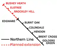 - The existing Underground line would be extended north-west from Edgware by 5 kilometres to a new terminus at Bushey Heath and a depot at Aldenham. The extension to Bushey Heath involved three new stations (from south-east to north-west):