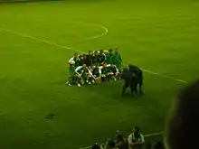 During the 1940 New Year's Day match, Easter Road was covered with a thick fog that would normally cause a football match to be abandoned.[40] Due to the match being played during wartime, and it being broadcast widely by the BBC for the entertainment of soldiers stationed overseas, the War Office ordered play to go ahead to avoid alerting the Luftwaffe to the bad weather conditions.[40] Commentator Bob Kingsley could not see the pitch either and had to improvise.[40] Using a series of runners to tell him if there were any goals scored, he created his own version of the match.[40][41] This was later described in The Scotsman as "Fawlty Towers ahead of itself" and adapted into a BBC Radio Four play by Scottish playwright, Andrew Dallmeyer.[41]