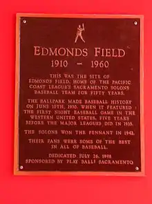 Edmonds Field was home to the Sacramento Solons, the Pacific Coast League AAA team until 1960 when they moved to Hawaii. On April 12, 1964, prior to it being demolished to make way for a Gemco discount store, the last baseball game played there was an exhibition game between the San Francisco Giants and the Cleveland Indians. That game featured back-to-back home runs by Willie Mays and Willie McCovey, both hit over the towering walls in right center field.