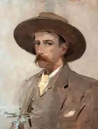 After graduating from college, he entered the prominent architectural firm of Emerson and Fehmer, but decided to pursue a career as an artist instead.[3] He received his initial art instruction from Jean-Léon Gérôme at the École des Beaux-Arts in Paris. He studied there for five years, altogether. During that time, he also travelled throughout Europe. In 1878, while making copies in the Louvre, he met Agnes Fitzgibbon, from England. They were married shortly after.[4]