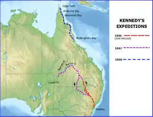 Edmund Besley Court Kennedy J. P. (5 September 1818 – December 1848) was an explorer in Australia in the mid nineteenth century. He was the Assistant-Surveyor of New South Wales, working with Sir Thomas Mitchell. Kennedy explored the interior of Queensland and northern New South Wales, including the Thomson River, the Barcoo River, Cooper Creek, and Cape York Peninsula.[1] He died in December 1848 after being speared by Aboriginal Australians in far north Queensland near Cape York.