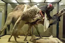 Verreaux designed and constructed the orientalist taxidermy diorama Lion Attacking a Dromedary for the Paris Exposition of 1867, where it won a gold medal.[2][3] After the exposition, it was sold to the American Museum of Natural History, who exhibited it at the 1876 Centennial Exposition.[4] The diorama was sold to the Carnegie Museum of Natural History in 1898, where it was displayed until its removal in 2020. The museum cited the work's lack of cultural accuracy and concerns raised by the Black Lives Matter movement as the reasons for the removal.[2] In 2021, the diorama was put back on display at the Pittsburgh museum.