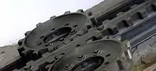 This system provides very stable attachment to the track, also protecting the car from toppling over even under the most severe crosswinds. Such gears are also capable of leading the car, so even flanges on running wheels are optional. The biggest shortcoming of the system is that the standard railway switch is not usable, and a transfer table or other complex device must be used where branching of the track is needed.