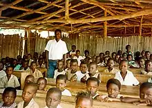 Benin has abolished school fees and is carrying out the recommendations of its 2007 Educational Forum.[1] (Its education system used not to be free.[2]) In 2018, the net primary enrollment rate was 97 percent.[3] Gross enrollment rate in secondary education has greatly increased in the last two decades, from 21.8 percent in 2000 to 59 percent in 2016, 67.1 percent in the case of males and 50.7 percent for females.[4] Because of a rapid increase in the enrollment rate, the student/teacher ratio rose from 36:1 in 1990 to 53:1 in 1997 but has dropped again in the last years to 39:1 (2018).[5] In 2018, the gross enrollment ratio in tertiary education was 12.5%.[6]