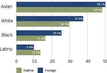 Only among Hispanics and Latinos was the proportion of college graduates larger among the native born population. In the general population the proportion of persons with a bachelor's degree or higher was the same among the foreign-born and native-born population (27.2%). As stated above fewer foreign born Americans completed high school than native born Americans. Overall, 87.5% of the native born population had graduated from high school, versus 67.2%. Among whites the difference was three percentage points, the same as for African Americans. Among Asian Americans the difference was five percentage points. It was thirty percentage points among Hispanics or Latinos.[3]