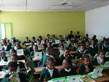 M-learning (or m-education), or the use of mobile technology in the service of education, is a recent practice, opening up fresh possibilities in the educational field. Given the shortage of books in many African schools, the digital tablet was soon seen as a solution to make up for the missing textbooks, and taken up both by governments and international organizations. In practice, this shortage is one that affects almost every African country. In Cameroon there is on average one textbook on reading per 11 pupils and one mathematics book per 13 children.[16] The price of digital content on tablets is falling sharply compared to the traditional media (books, CD and DVD, etc.). One digital textbook, for instance, costs one-third to half the price of a paper textbook,[17] with zero marginal cost.[1]