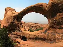In 1956 and 1957, Abbey worked as a seasonal ranger for the United States National Park Service at Arches National Monument (now a national park), near the town of Moab, Utah. Abbey held the position from April to September each year, during which time he maintained trails, greeted visitors, and collected campground fees. He lived in a house trailer that had been provided to him by the Park Service, as well as in a ramada that he built himself. During his stay at Arches, Abbey accumulated a large volume of notes and sketches which later formed the basis of his first non-fiction work, Desert Solitaire.[15] Abbey's second son Aaron was born in 1959, in Albuquerque, New Mexico.[16]