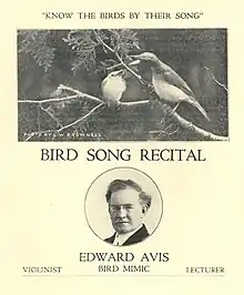 Avis was a careful imitator of birds and he often performed before academic audiences. He also included a mix of his mimicry with the violin.[3] He also performed for blind audiences.[4] He was a contemporary of Charles Crawford Gorst, Charles Kellogg and several others who specialized in the imitation of birds. His promotional brochures included reviews by John Burroughs and Winthrop Packard. Many recordings were made by Avis for Columbia Records and after the rise in popularity of the radio, he also contributed to radio shows.[2]
