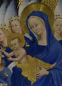 ![]() Possible depiction of Edward and his mother Joan as the infant Jesus and the Virgin Mary on the Wilton Diptych, c. 1395 | |