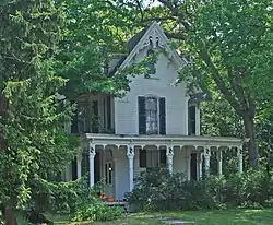 The Edwin Trump House is a two-story, wood-framed Gothic Revival structure built in a T-shape with multiple gables and dormers. It has a decorative open porch, containing Gothic ornamentation in its bargeboards, which match the bargeboards in the eaves of the gables.[2]