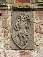 The carvings are all based on popular series of engravings, which were often published in pattern books. Nuremberg was the origin of numerous such books, and one may have been brought to Edzell by the miner Hans Ziegler.[31] Specifically, the images of the deities are derived from engravings of 1528–29 by the German artist Georg Pencz (or Iorg Bentz, c. 1500–1550), a pupil of Albrecht Dürer; the initials I. B. appear on the carving of Mars. The arts and virtues are both based on engravings derived from paintings by the Flemish artist Marten de Vos.[32] The engravings, by Jan Sadeler and Crispijn de Passe, were widely distributed in Scotland, along with those of the deities. Indeed, the image of Prudence is identical to that used by the King's Master of Works William Schaw, in the spectacular display to welcome Queen Anne to Scotland, following her marriage to James VI in 1589.[33]