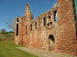 The two-storey west range contains the main entrance, which enters the courtyard via an arched passage. Above the outside gate are spaces where armorial panels were once displayed. The windows on this front, larger than the original ones in the tower house, had iron grilles, and small gun holes beneath them. Beside the entrance was a kitchen, and above, a larger hall and drawing room. Only the western part of the three-storey north range was completed, although the Lindsays planned to complete the courtyard. This range had another kitchen, as well as private chambers within the round tower at the north-west corner. It was entered via a stair turret in the courtyard, fragments of which remain, including parts of an intricately carved door surround. Only the foundations of the east and south buildings remain, which probably contained a bakehouse and stables.[27]