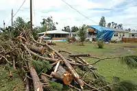 A wind gust of 51 mph (82 km/h) was reported at Dothan, with minimum barometric pressure reaching 999.2 mb.[12] It is reported that the worst damage occurred in Escambia and Monroe counties. In the Escambia County city of Atmore, 100 percent of the city's residents lost electric power for some a period of time during the hurricane.[17] The strongest winds occurred in Escambia County, where gusts surpassed 70 mph (110 km/h), leaving numerous structures damaged or destroyed as Dennis tracked through the western half of the county.[18] One man in the county was injured by a fallen tree branch. Also, an unconfirmed tornado tore the roof off a home, forcing emergency workers to evacuate a man inside.[19] In Coffee County, local officials reported wind gusts had blown a carport into a wall of a house.[13] Marengo County received moderate damage, mostly limited to power outages and minor roof and structural damage caused by fallen trees and powerlines. Many customers were without electric power for at least a day, and numerous county roads were covered with debris.[20] A person was injured in Dallas County when a tree landed on their car. Five homes and one business were damaged due to high winds, and thousands of people county-wide experienced power outages.[21] Greene County reported hundreds of downed trees and powerlines causing County Roads 148 and 20 and State Highways 11, 43 and 14 to be temporarily closed. In Forkland, a mobile home caught fire when a powerline fell on the home. A motorist ran into a fallen tree in Boligee although did not sustain injuries.[22] In Perry County, 2,200 homes were without electric power for several hours, and several vehicles and homes were damaged.[23] A structural fire occurred in Russell County and was believed to be ignited by downed powerlines.[24]