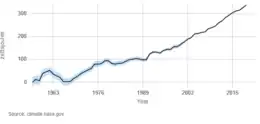 Presently (2020), atmospheric carbon dioxide (CO2) levels of more than 410 parts per million (ppm) are nearly 50% higher than preindustrial levels. These elevated levels and rapid growth rates are unprecedented in the geological record's 55 million years.[4] The source for this excess CO2 is clearly established as human-driven, reflecting a mix of fossil fuel burning, industrial, and land-use/land-change emissions.[4] The idea that the ocean serves as a major sink for anthropogenic CO2 has been discussed in scientific literature since at least the late 1950s.[4] Several pieces of evidence point to the ocean absorbing roughly a quarter of total anthropogenic CO2 emissions.[4]
