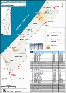 The Palestinian Red Crescent estimates that thousands of homes have been damaged and it became "increasingly difficult" for their residents to stay in them due to the cold weather.[14] The UNRWA has prepared its schools to act as temporary shelters for displaced persons.[13] As reported by both the Save the Children Alliance and the Al Mezan Center, prior to the IDF ground operation on 3 January, more than 13,000 people (2000 families) have been displaced in the strip.[14] The majority of those families seek shelter with relatives while others are staying at the temporary emergency shelters provided by the UNRWA.[14] As of the thirteenth of day the Israeli military operation, 21,200 displaced Palestinian people were staying at these shelters.[15][16] By the third week of the attacks, this number has increased by 14,300 refugees, reaching 35,520 Palestinians staying under the UNRWA shelters.[17] In the same period, Al Mezan Center also estimated that a total of 80,000-90,000 Palestinians have been displaced, including up to 50,000 children.[10] As the numbers of displaced refugees constantly increased the UNRWA had to open new emergency shelters throughout the Gaza strip. The shelters were overcrowded and were sheltering double their originally planned capacities.[18]