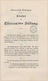 The Efferenn's Trust was founded in 1881 by the last will of the independent gentleman Carl August Efferenn. The starting capital was 40,000 Marks, i.e. today approximately €250,000. The trust was managed by the academic officers of University of Tübingen. It was primarily set up for supporting a relative of the donor, who studied in Tübingen. If no candidate of the family applied, the scholarship could be given to a poor but intelligent student of the university, if he was a protestant and from Württemberg.