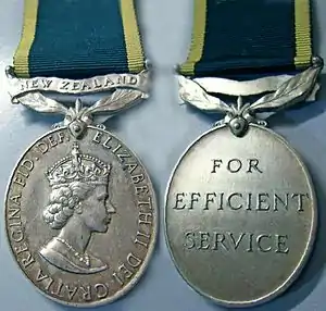 The Efficiency Medal is a long service award for warrant officers, non-commissioned officers, and other ranks of the New Zealand Territorial Force. It is awarded for 12 years of continuous and efficient service. First awarded in 1931, it was a replacement for the Colonial Auxiliary Forces Long Service Medal, which was first awarded in 1902. New Zealand is one of the few countries that continues to award the Efficiency Medal.